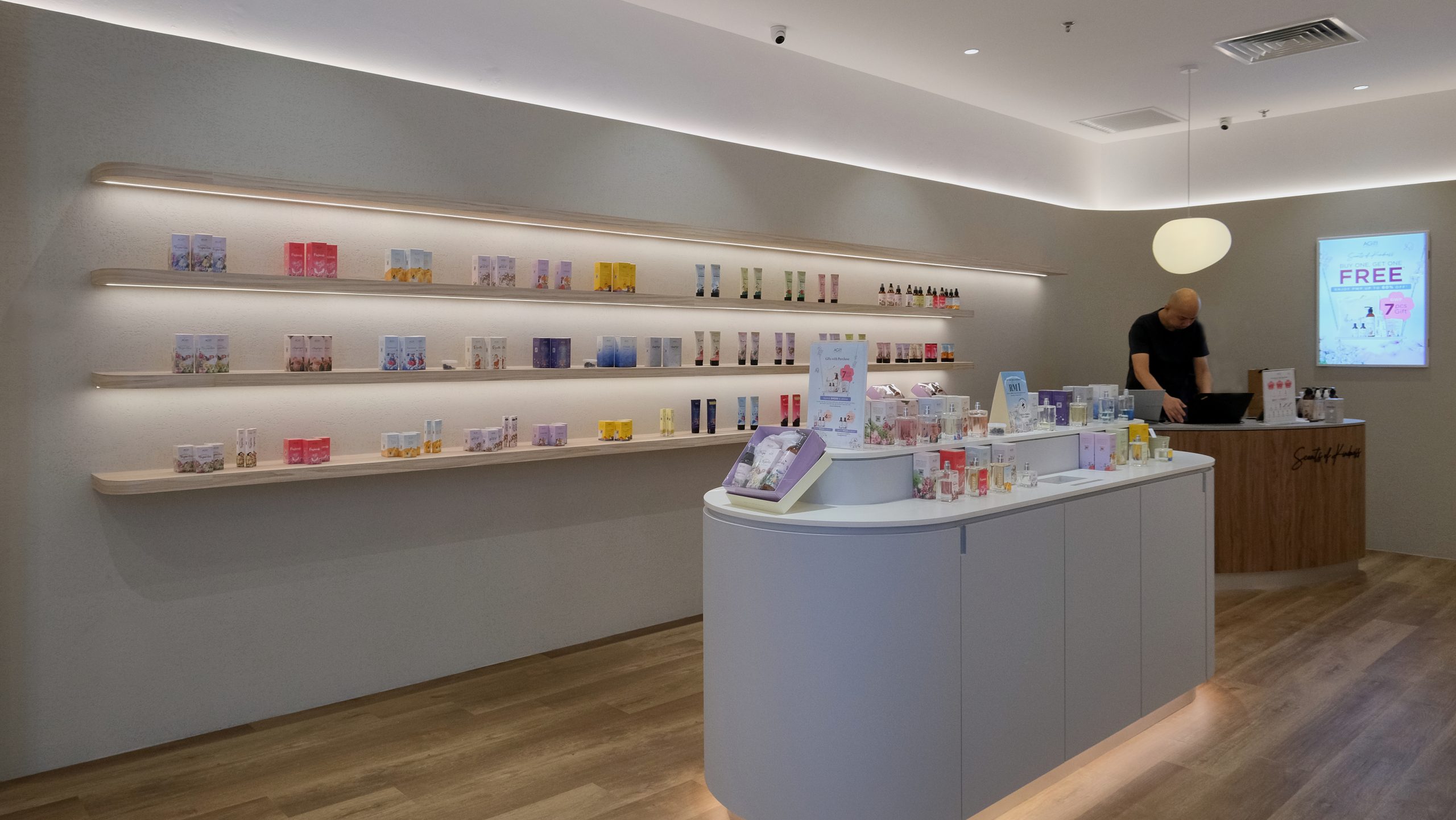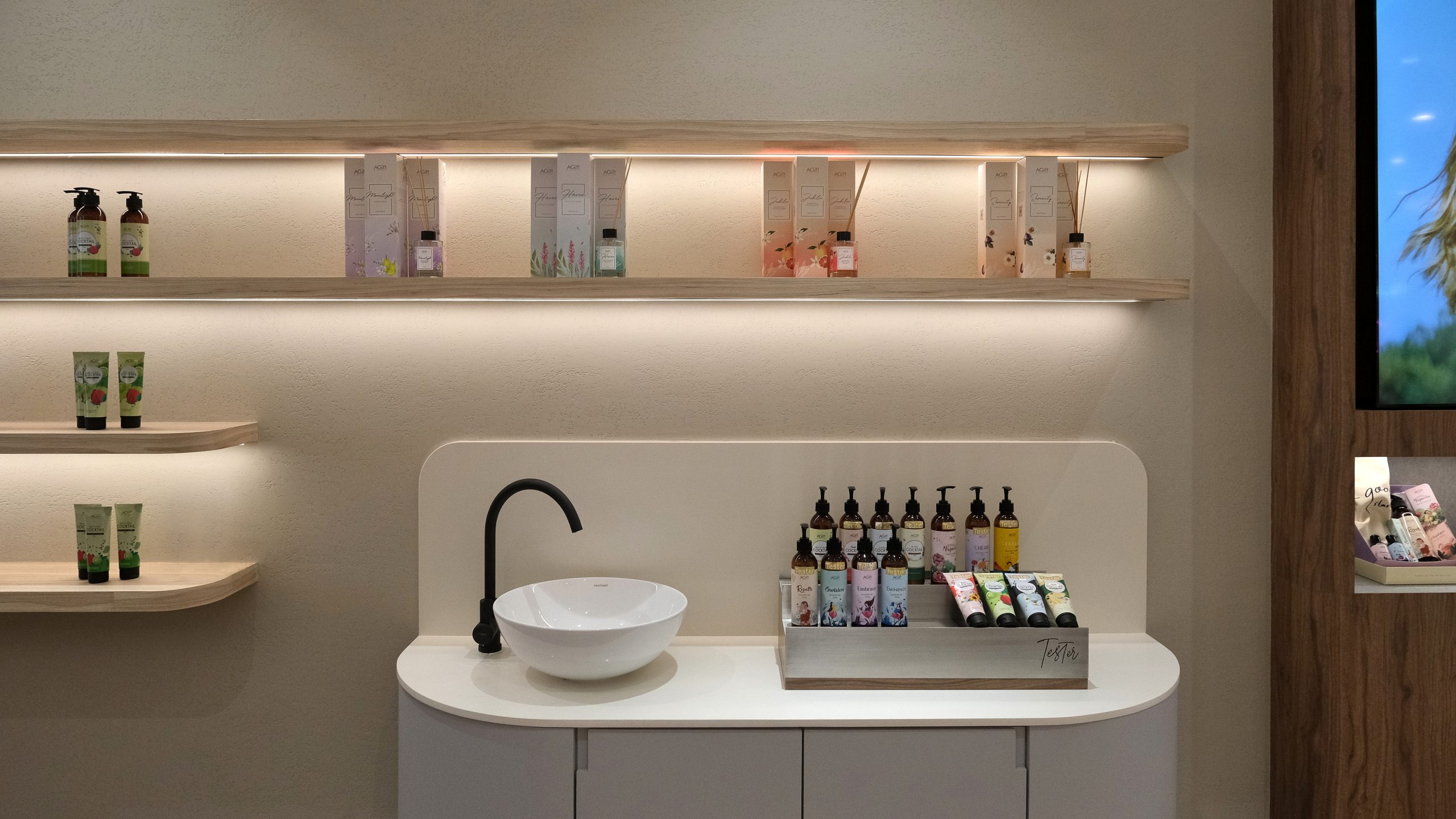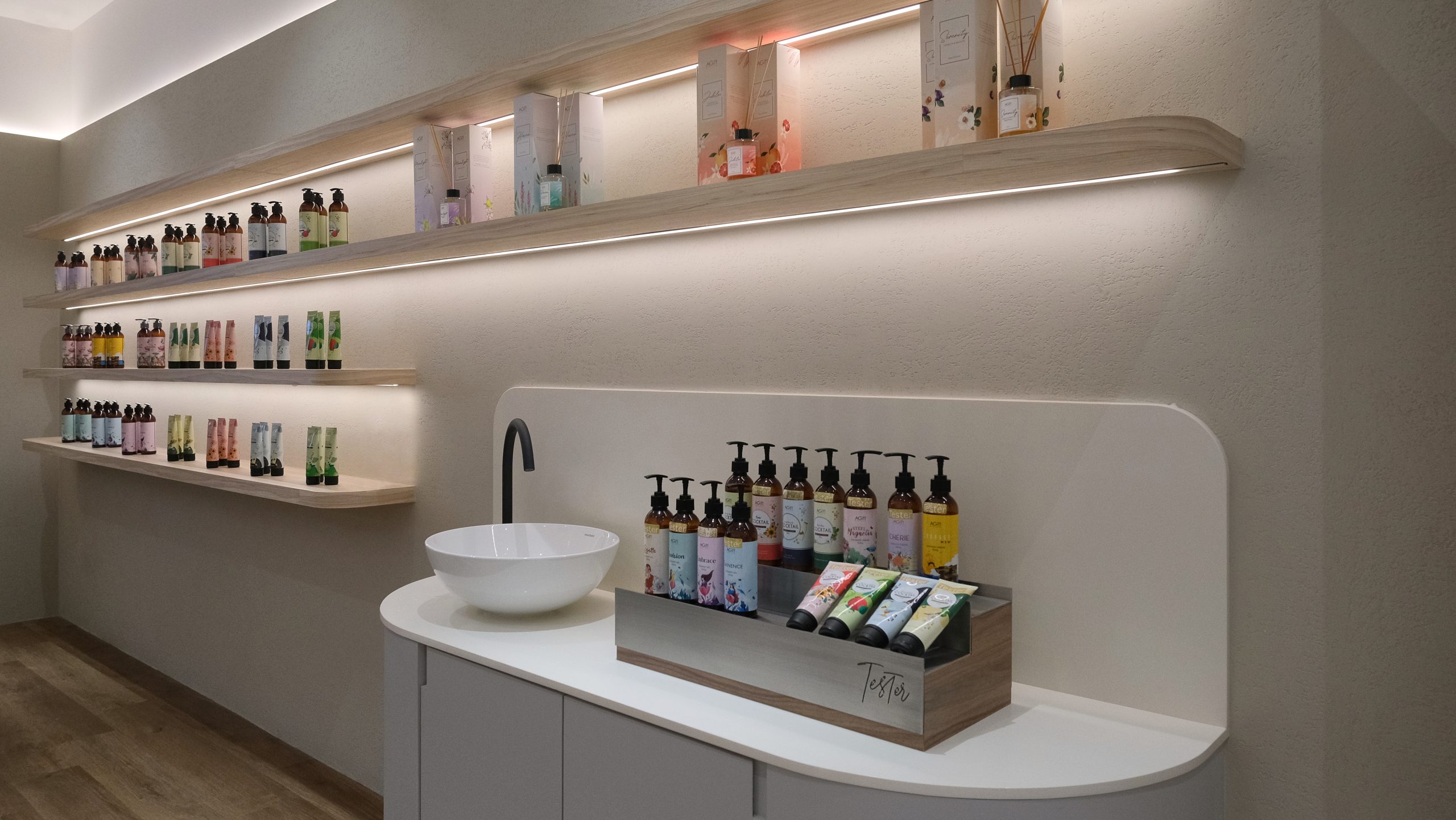 Stepping into the shop, customers are immediately enveloped in a serene and calming atmosphere. The design embraces a palette of neutral colors—soft beiges, warm taupes, and off white—creating a tranquil environment that soothes the senses. The minimalist aesthetic design is thoughtfully chosen to contrast with the colorful and vibrant packaging of the products, allowing them to stand out as the true stars of the space. Clean lines and uncluttered surfaces define the shop, with simple, elegant shelving that showcases the products without distraction. Natural light filters through large windows, enhancing the airy and open feel of the shop, while subtle, ambient lighting adds a gentle glow, perfect for exploring the fragrant offerings. Every element of the design is meticulously curated to ensure a harmonious and inviting experience, making it a peaceful retreat for those seeking their signature scent.