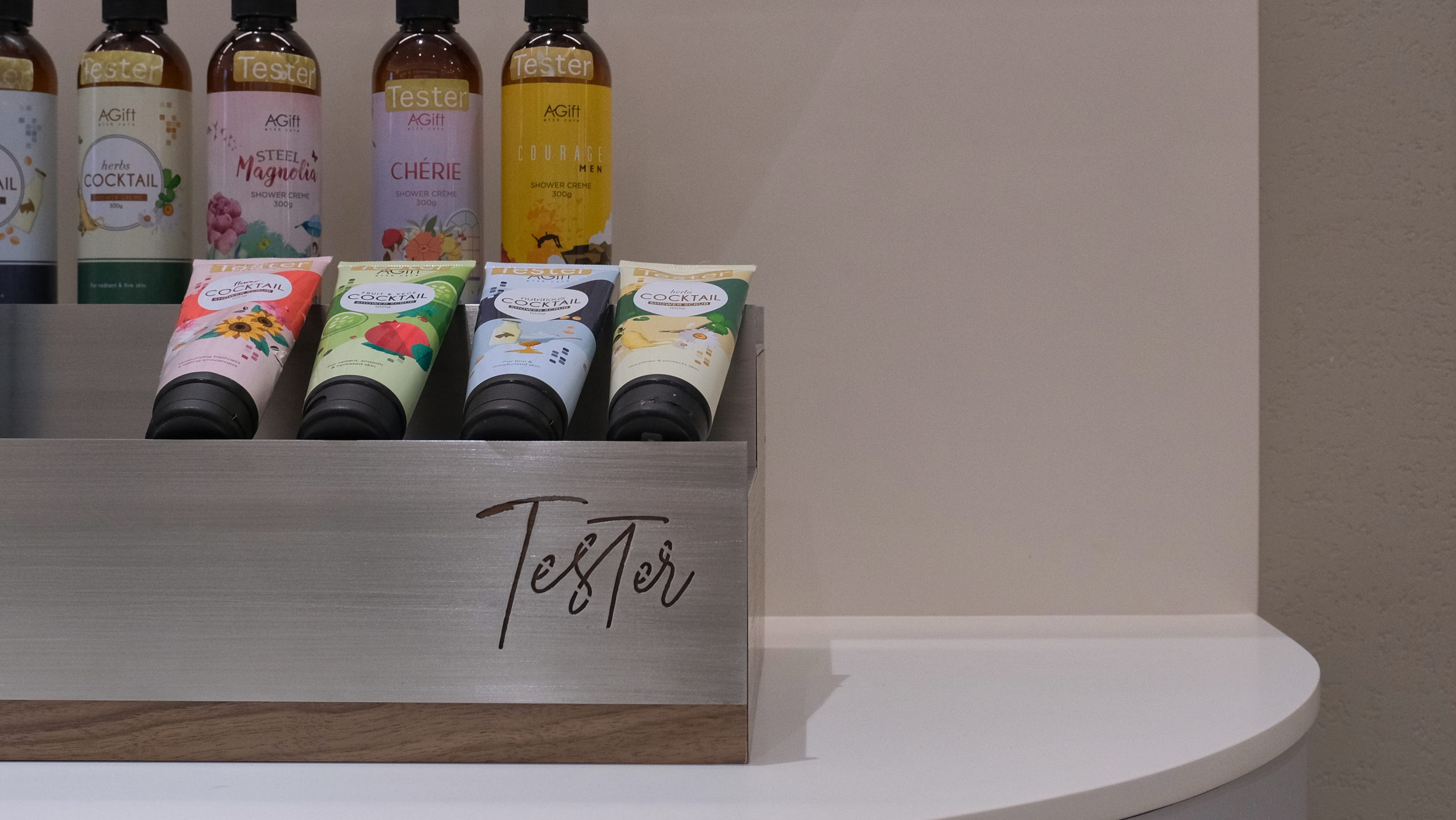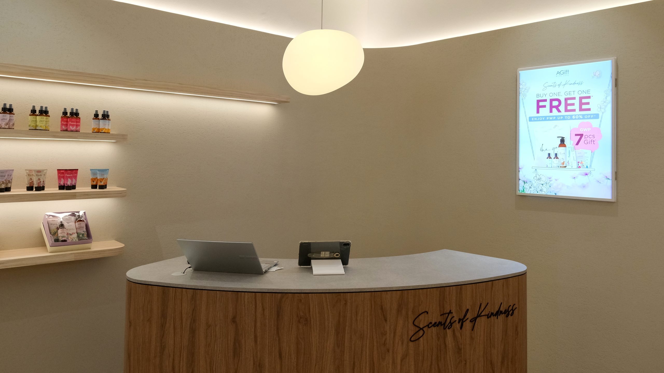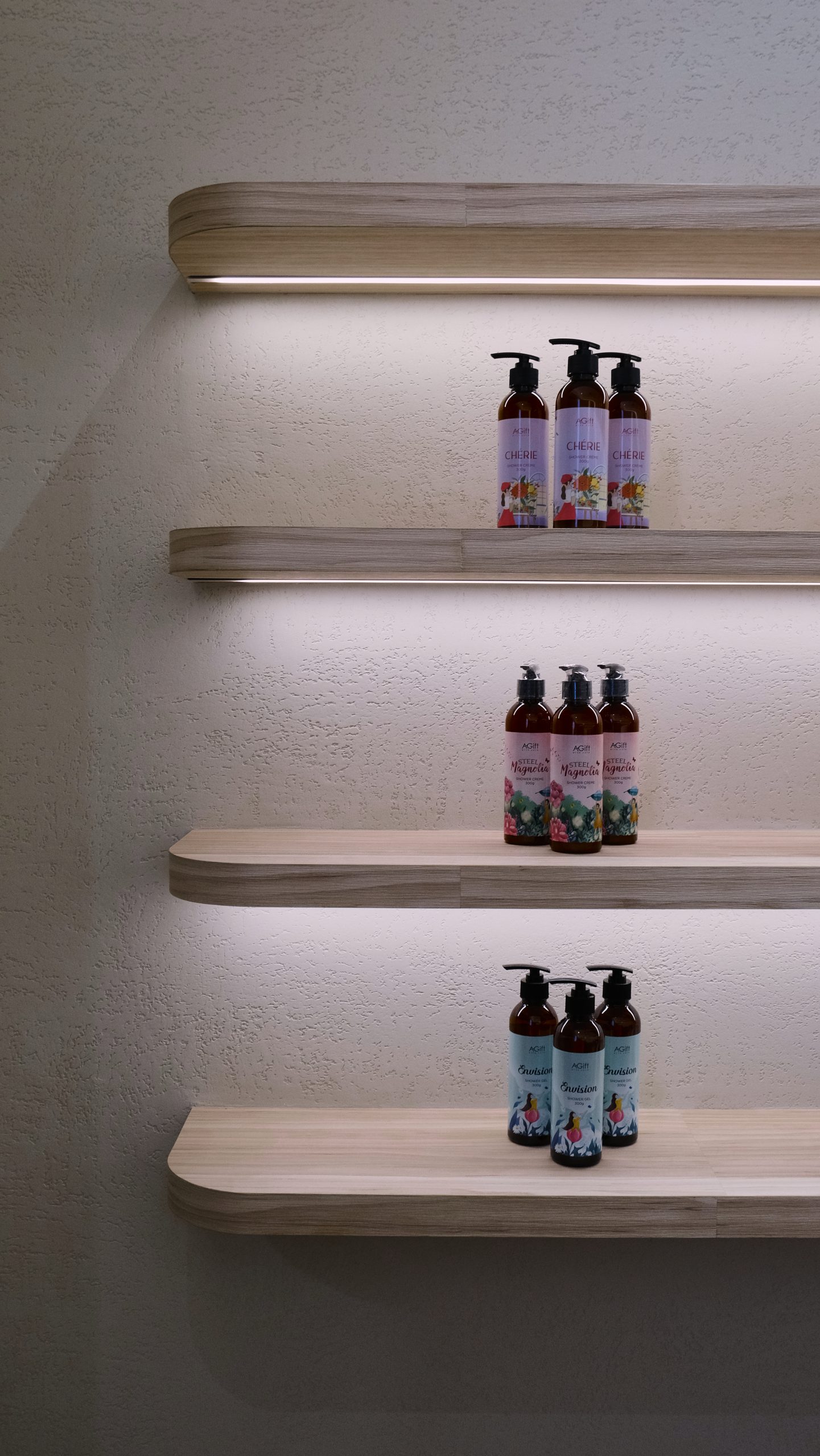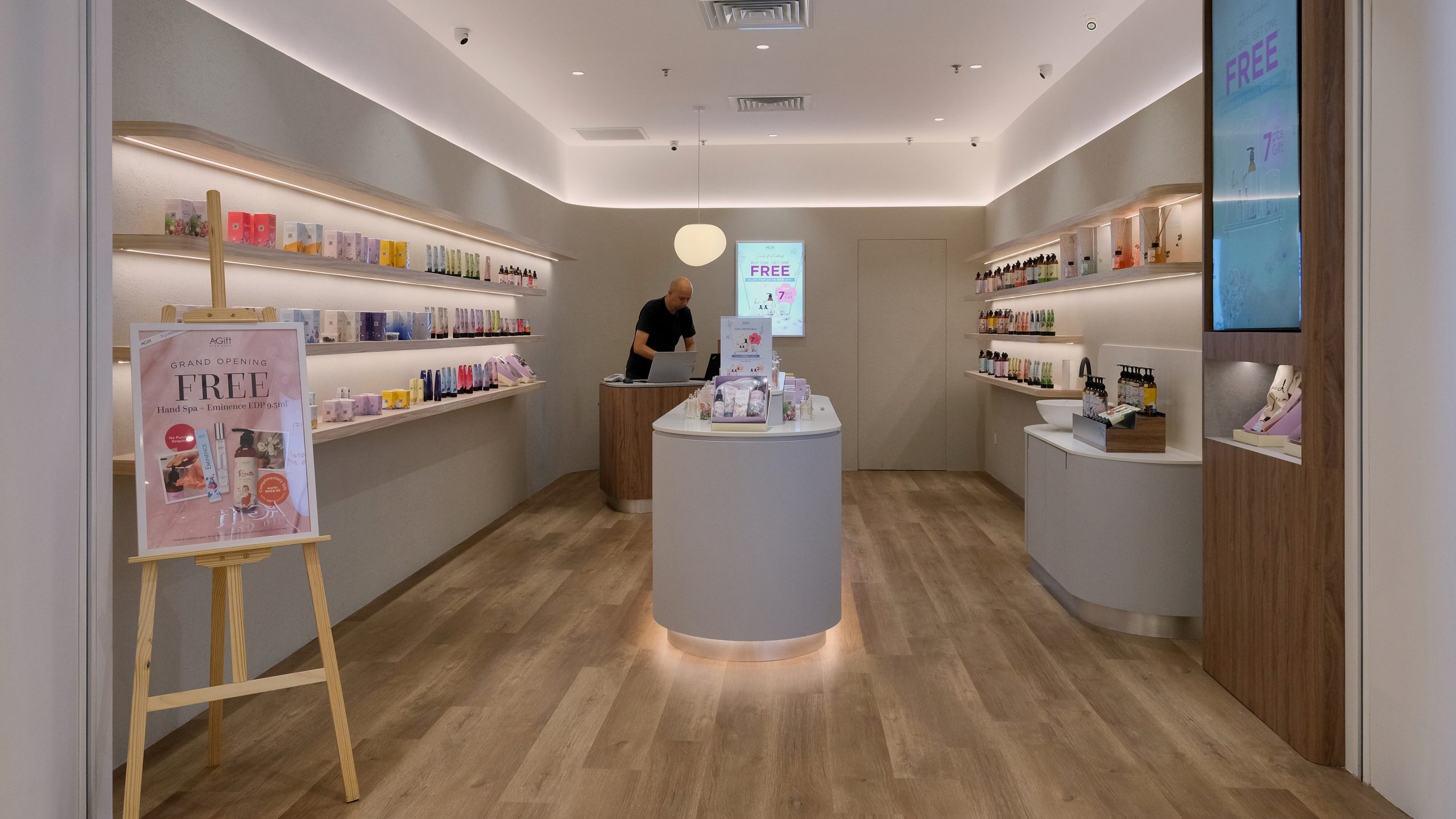 Stepping into the shop, customers are immediately enveloped in a serene and calming atmosphere. The design embraces a palette of neutral colors—soft beiges, warm taupes, and off white—creating a tranquil environment that soothes the senses. The minimalist aesthetic design is thoughtfully chosen to contrast with the colorful and vibrant packaging of the products, allowing them to stand out as the true stars of the space. Clean lines and uncluttered surfaces define the shop, with simple, elegant shelving that showcases the products without distraction. Natural light filters through large windows, enhancing the airy and open feel of the shop, while subtle, ambient lighting adds a gentle glow, perfect for exploring the fragrant offerings. Every element of the design is meticulously curated to ensure a harmonious and inviting experience, making it a peaceful retreat for those seeking their signature scent.